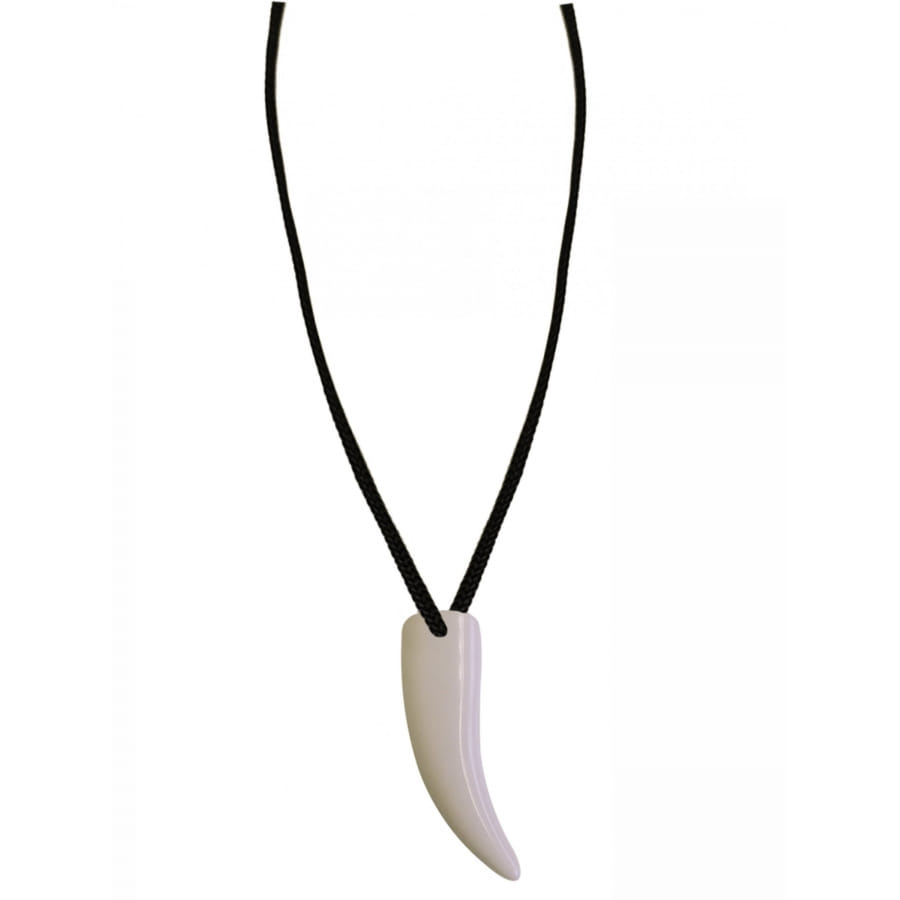 Le collier de Brice de Nice est constitué d'une fine corde noire et d'une fausse dent blanche de requin en guise de pendentif.