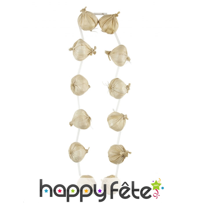 Ce collier au style atypique sort complètement de l'ordinaire et son rôle est tout aussi singulier. Composé entièrement de 12 gousses d'ail factices, il est d'un réalisme impressionnant et fait 48 cm de long. Il vous offrira un riposte imparable contre tous vos ennemis vampires.