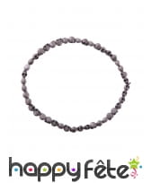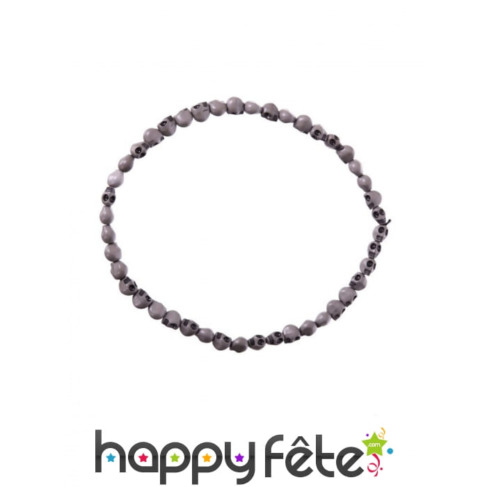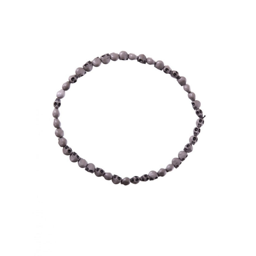 Ce collier est confectionné avec des perles grises en forme de petits crânes de squelettes.