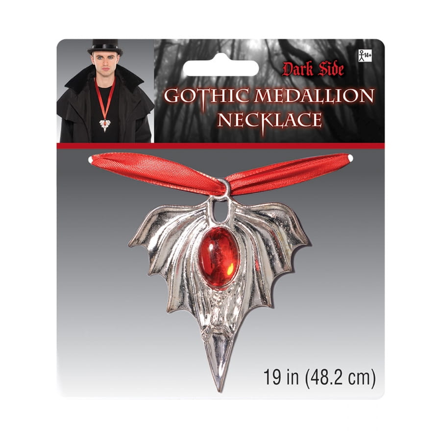 Le collier de vampire avec médaillon et pierre rouge est un bijou unisexe pour adulte.