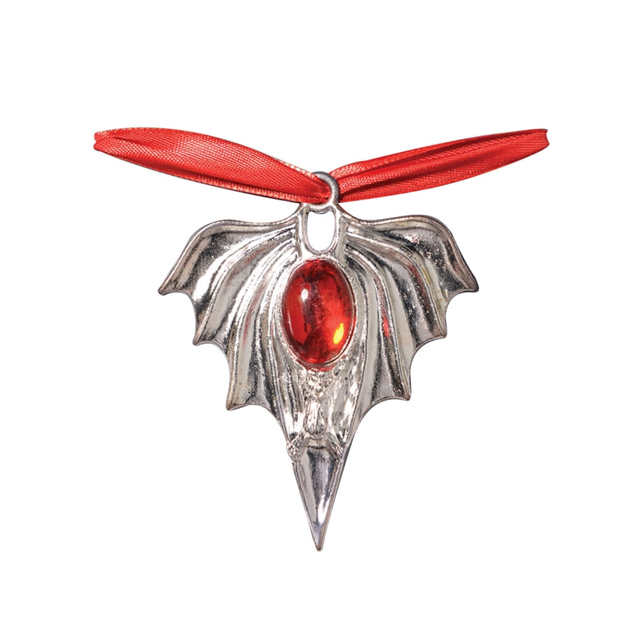 La chaîne est un ruban rouge agrémenté d'un pendentif en forme d'ailes de chauve-souris.