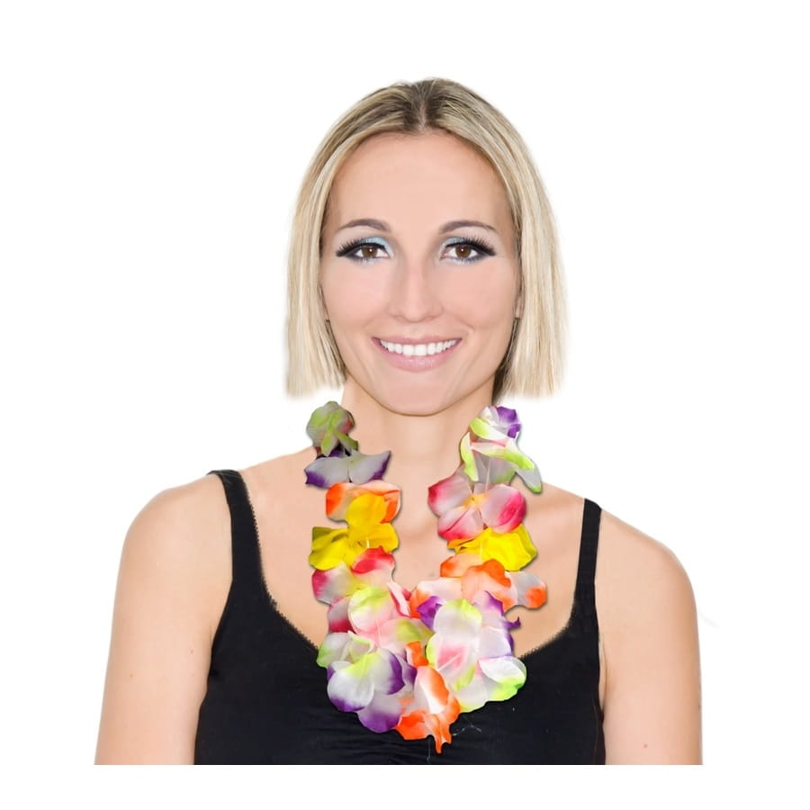 Mesdames, choisissez de porter ce magnifique collier pour orner vos déguisements du carnaval, ou pour une fête à thème exotique ou autour du monde. IL s'agit d'un collier hawaien, avec de jolies fleurs multicolores, de style néon. Ce collier se mariera à merveille avec une belle tenue exotique. Il est fait en tissu et mesure 45 cm.