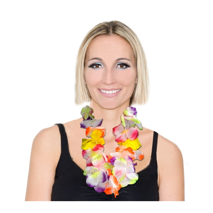 La petite touche exotique qui pourra transformer une simple tenue en tenue des îles, c'est le collier de fleurs. Même si vous êtes en jean, en short, en jupe ou peu importe, avec un collier de fleurs couleur néon, tout devient exotique ! Ici, nous avons un collier Hawaïen en tissu, très résistant, avec des fleurs de couleur néon, qu’homme ou femme pourra porter sans problème. Un collier de fleurs autour du cou et un petit cocktail à la main, c'est ça la belle vie !