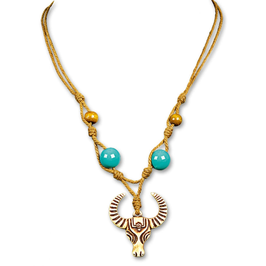 Il s'agit d'une cordelette marron sur laquelle on retrouve des perles turquoises avec un médaillon en forme de tête de bison.