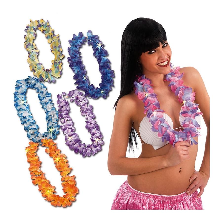 Quand la culture hawaïenne est la bienvenue dans une soirée déguisée, le collier led hawaïen devient la star ! Cet accessoire ultra exotique est formé par une succession de magnifiques pétales colorés en tissu avec des petites lampes led. Ce collier original pour homme et femme se vend à l'unité. Il est disponible en différents coloris mais le choix de la couleur ne sera pas possible à la commande.