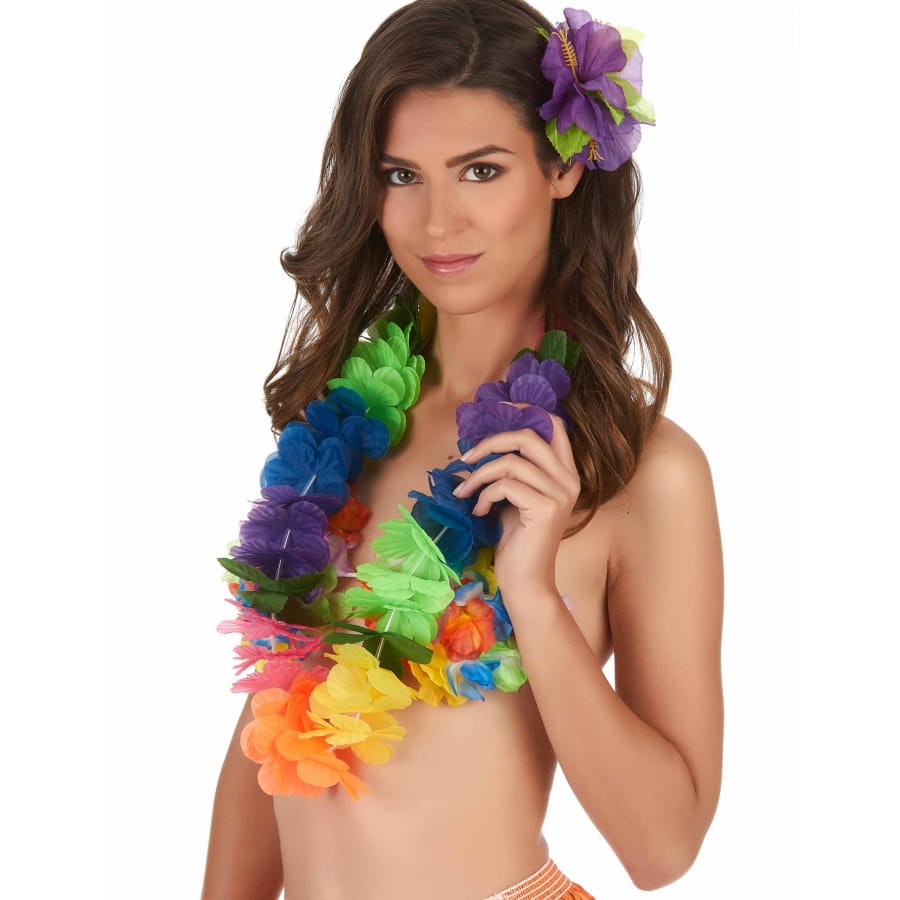 Lors du prochain carnaval choisissez un accessoire qui vous mettra sous les feux des projecteurs avec notre collier multicolore Hawaïen en tissu.
