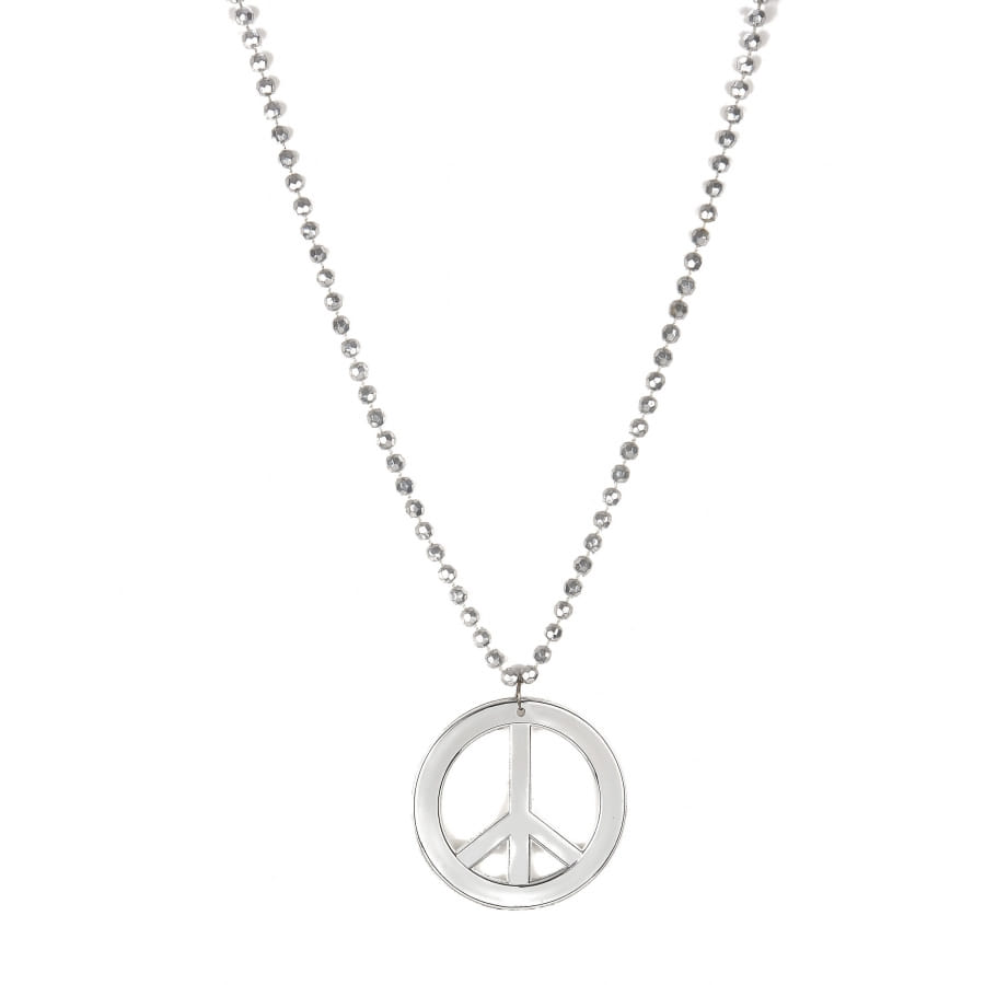 Le collier peace and love argenté avec pendentif de 7 cm pour adulte est en plastique.