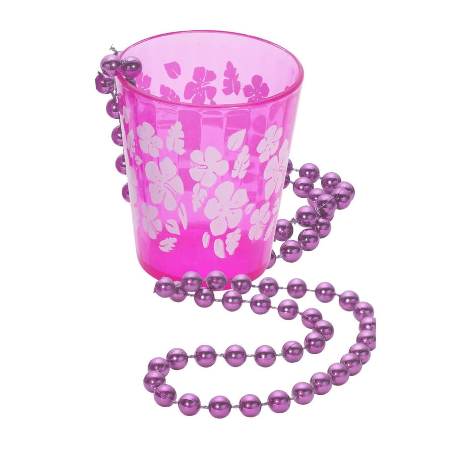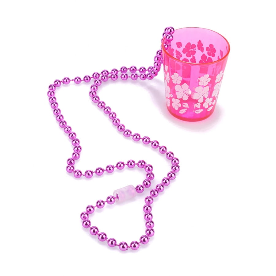 Le collier pendentif verre shooter rose pour adulte est en plastique rigide.
