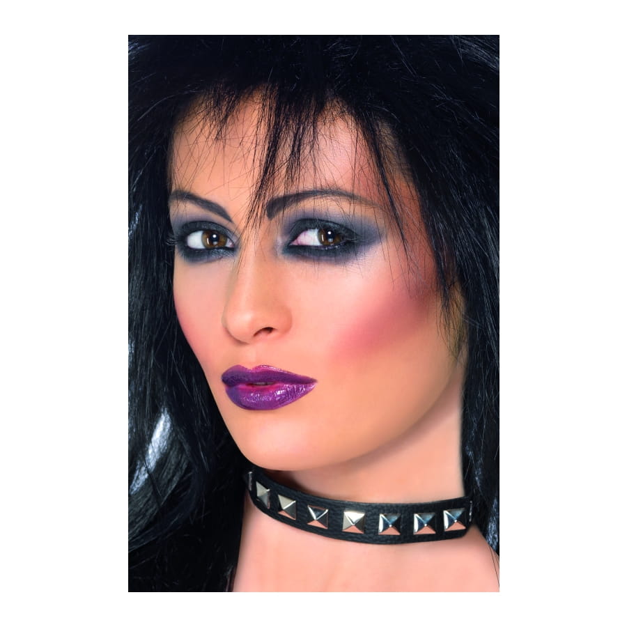 Mince collier punk de couleur noire avec clous en PVC argenté, pour homme ou femme. Ce collier peut convenir à une multitude de tenues rock ou punk et servira très bien pour une fête d'Halloween ou basée sur le thème punk.