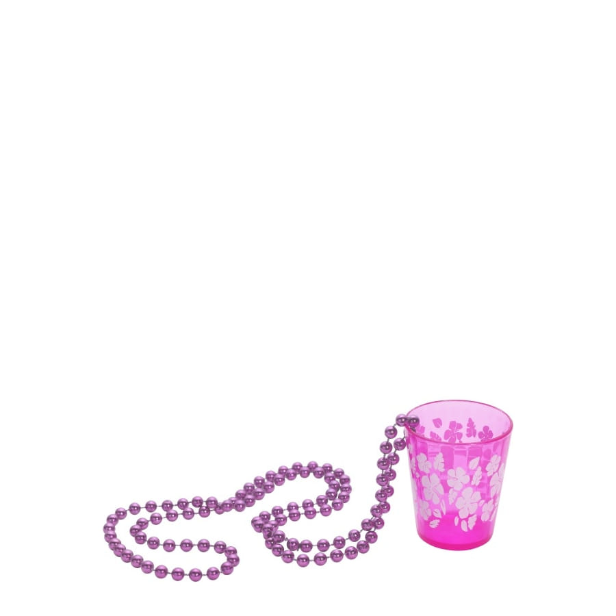 Long collier de perles de couleur violette, avec pendentif en forme de shot de couleur rose, pour fille. Ce collier est un accessoire que votre fille trouvera très joli et pratique pour y boire son jus.