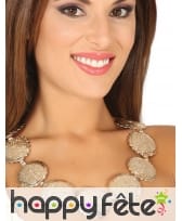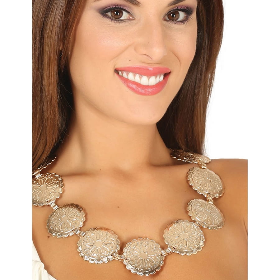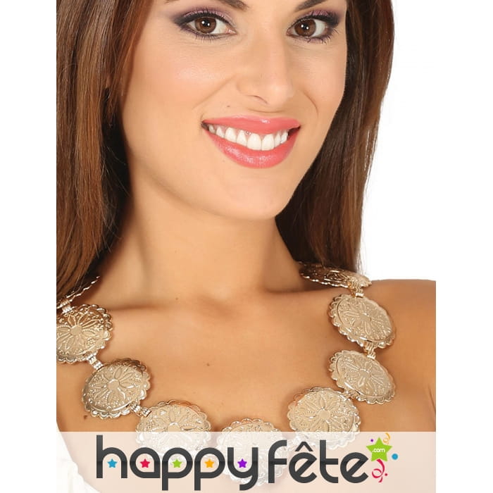 Le collier style Empire Romain de couleur argentée pour femme est un bijou constitué de plusieurs médaillons ronds.