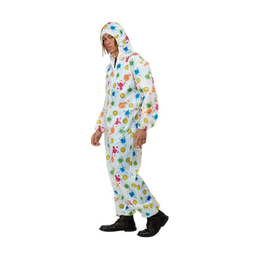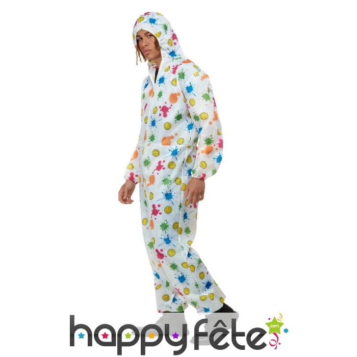 Optez pour un drôle de déguisement lors d'une soirée sur le thème des années 70 ou 80, avec la combinaison blanche imprimée de Smileys.