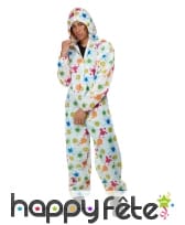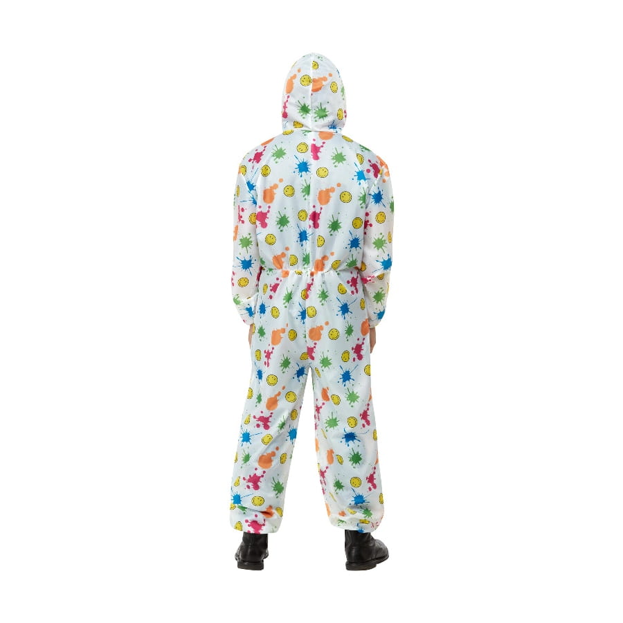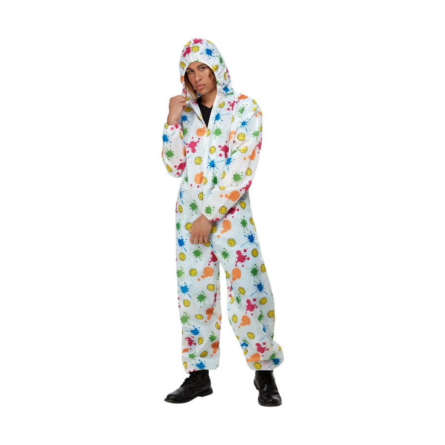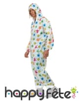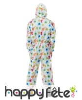 Il est question ici d'une combinaison à capuche comportant des motifs en forme de smileys et de tâches colorées.