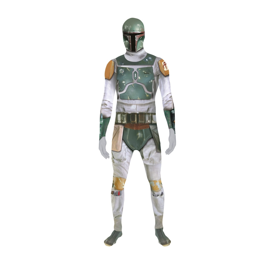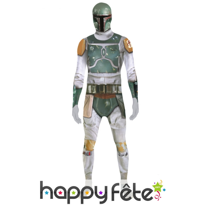 Vous voulez représentez le côté obscur de la force ? Il vous faudra ce déguisement combinaison Boba Fett réalité augmentée ! C'est un costume seconde peau, composé d'une combinaison complète qui couvrira votre corps dans son intégralité, et d'une cagoule qui dissimulera toute votre tête. Il représente le costume vert et blanc du chasseur de primes de Star Wars jusque dans les moindres détails. Et pour un effet encore plus bluffant, ce costume est également doté d'un dispositif de réalité augmenté. Il suffit de télécharger une application qui vous permettra de vous filmer dans le costume et de voir, à travers votre Smartphone ou tablette, des effets spéciaux venant s'ajouter au déguisement. Alors, si vous avez une soirée déguisée en vue ou une petite fête entre amis basée sur le thème "Science-fiction", ne ratez pas ce costume de Boba Fett hors du commun ! Il est sous licence officielle Morphsuit / Star Wars, existant en tailles L/M/XL.