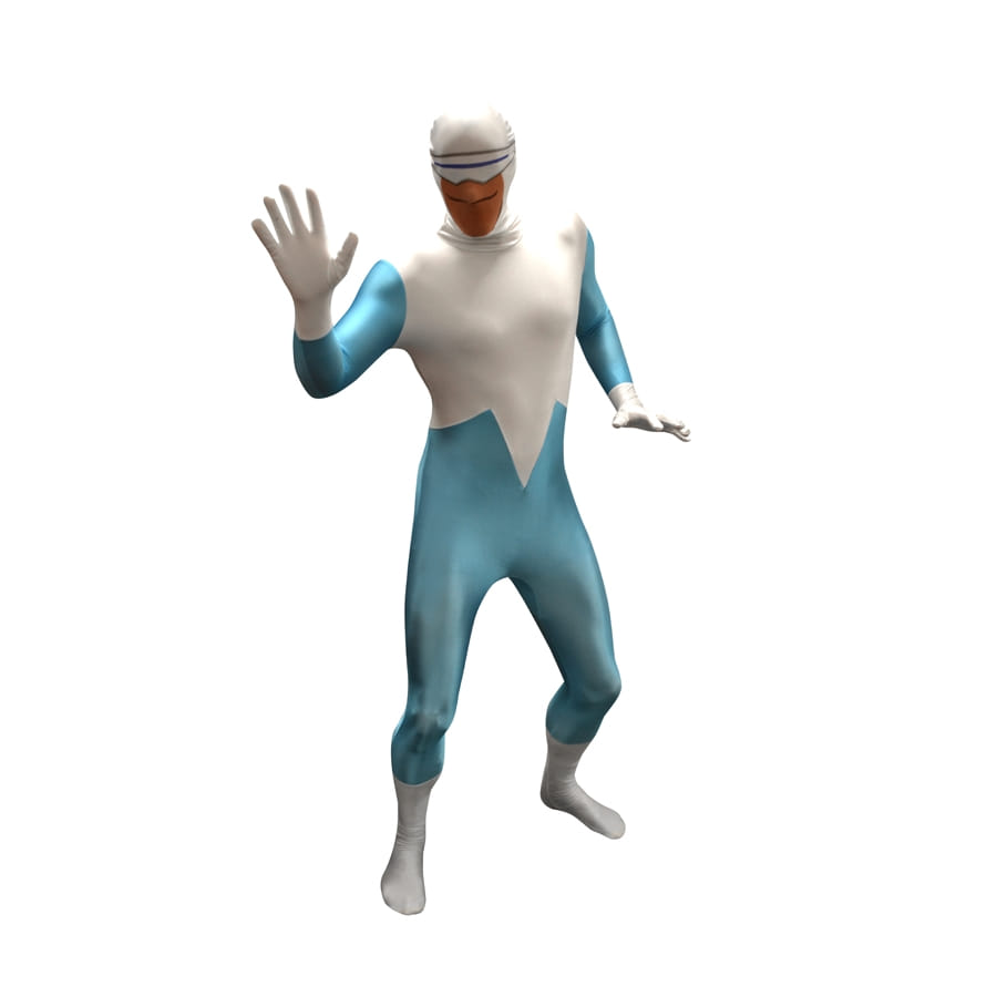 Nous avons le plaisir de vous présenter ce costume combinaison de Frozone Morphsuit ! Un déguisement original composé d'une combinaison intégrale ultra moulante représentant le costume de Frozone, un personnage des Indestructibles, un super héros, un excellent manipulateur de glace, ami de la famille Parr. Une cagoule assortie à la combinaison peaufine à merveille l'ensemble. Vous pourrez l'enfiler facilement grâce à une fermeture éclair dans le dos. Ce déguisement sous licence officielle Morphsuit / Les Indestructibles est conçu pour hommes et existe en tailles : L/ M. Il conviendra à tous vos événements déguisés.