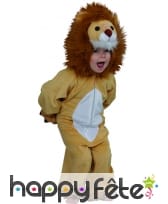 Enfin, cette tenue est équipée d'une capuche illustrant la tête de l'animal avec une fausse crinière qui entoure le visage de l'enfant.