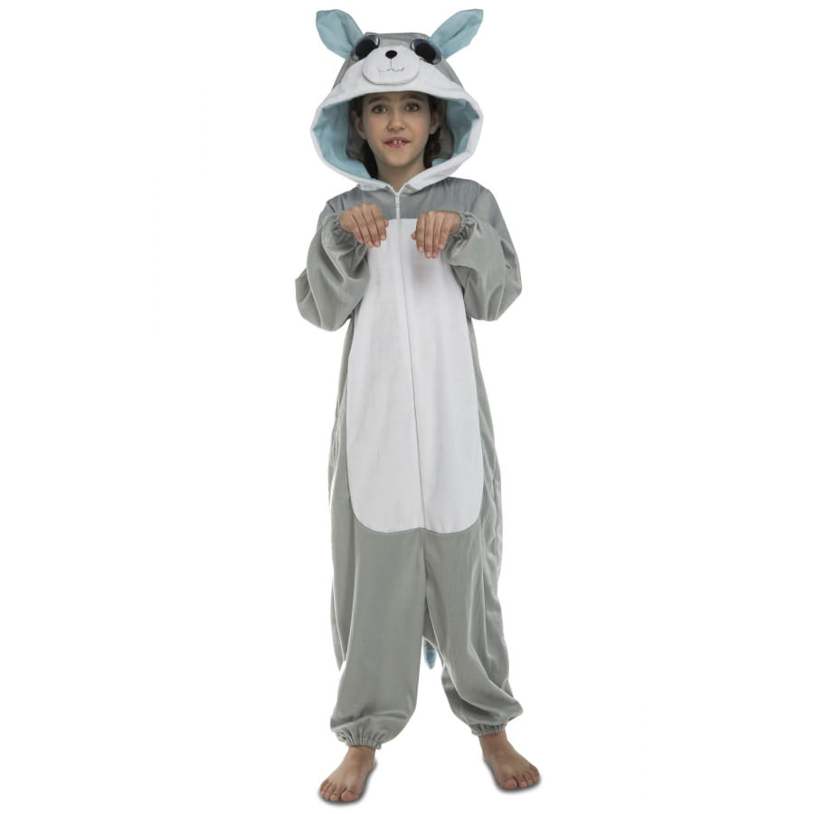 Ce déguisement est une combinaison grise dont la capuche représente une tête de loup.