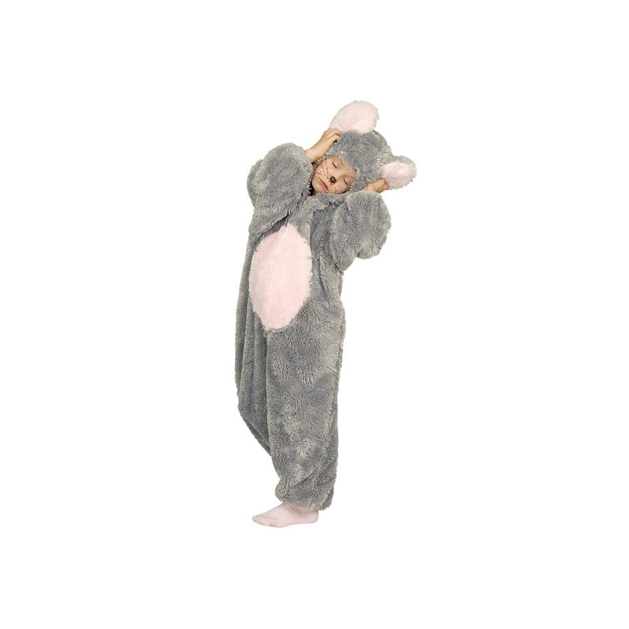 La combinaison de souris peluche pour enfant représente une souris de couleur grise avec un ventre rose.