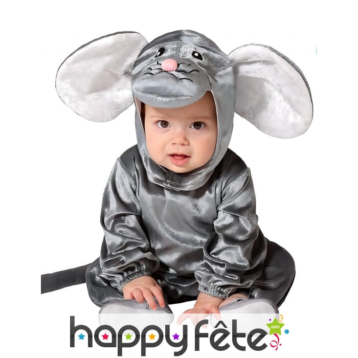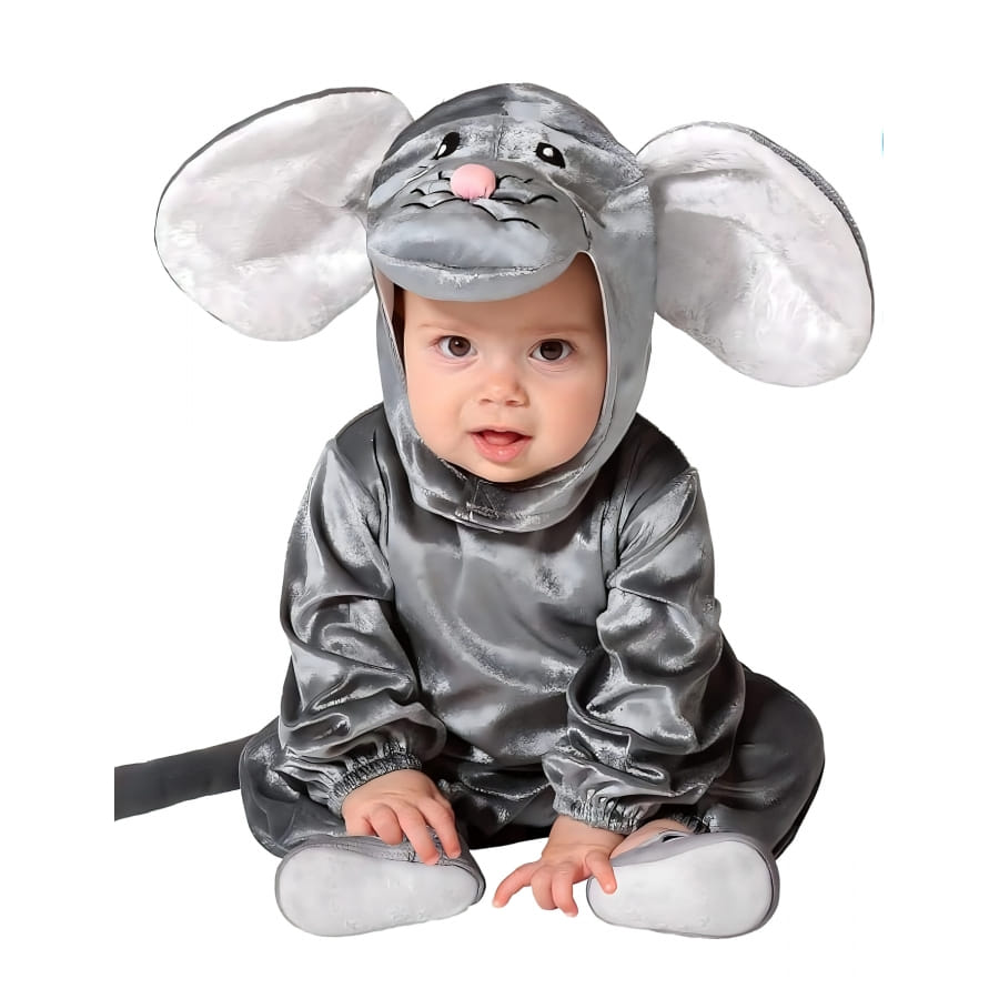 La combinaison, intégralement grise, est accompagnée d'une capuche à scratch représentant une tête de souris. Le visage de votre bébé restera découvert grâce à la fixation au niveau du menton, permettant ainsi une meilleure liberté de mouvement. La capuche est ornée d'un petit nez rose, des yeux malicieux et de grandes oreilles blanches qui apportent une touche de fantaisie à ce déguisement.