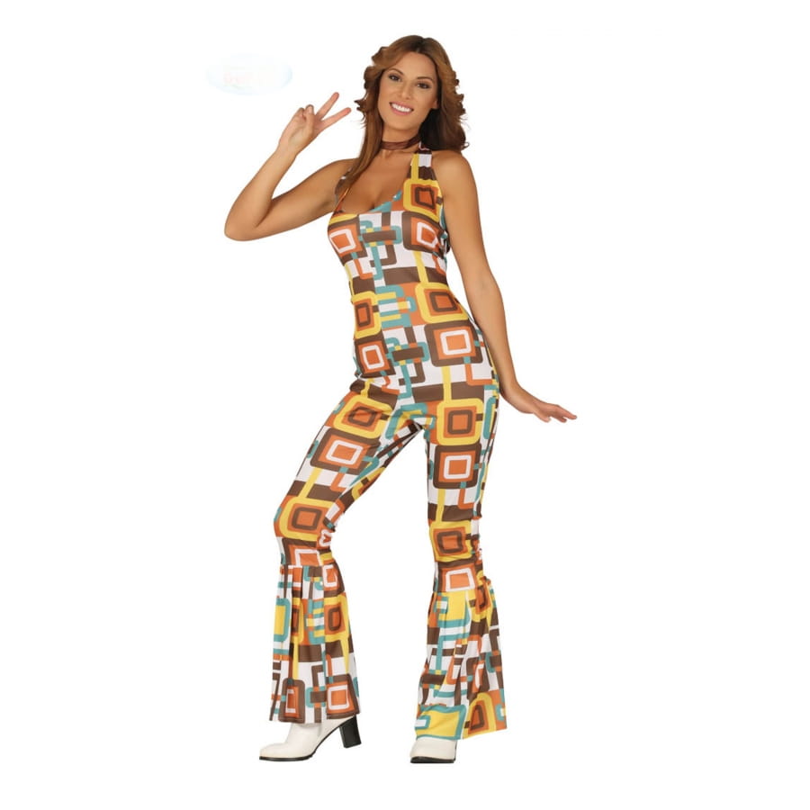 Pour la prochaine soirée rétro, portez haut le flambeau de la mode disco des années 70 grâce à la combinaison disco motifs rectangle marron, femme.
