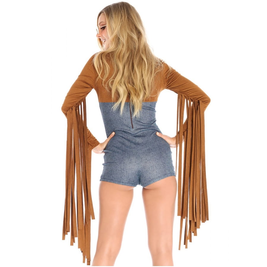 Mettez-en plein la vue à votre entourage avec cette combinaison hippie bleu marron longues franges.