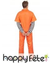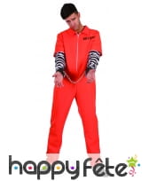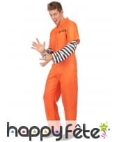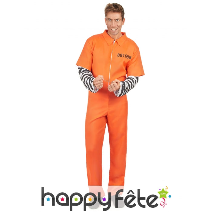 Le criminel le plus redouté de toute l'Amérique s'est évadé. Il se balade toujours dans sa combinaison immatriculée orange de prisonnier. Jouez le rôle d'un détenu fou à lier lors d'une soirée à thème. Pour réussir votre coup, vous porterez une combinaison à manches courtes avec fermeture zippée sur le devant. Elle est intégralement orange, sauf au niveau des manches. En effet, des manches à rayures noires et blanches ont été cousues à l'intérieur de la combinaison. Un numéro d'immatriculation a été imprimé sur le côté gauche, au niveau de la poitrine. Pour accessoiriser votre déguisement, n'hésitez pas à consulter la section accessoire de notre site où vous n'aurez aucun mal à vous dégoter une paire de menottes.