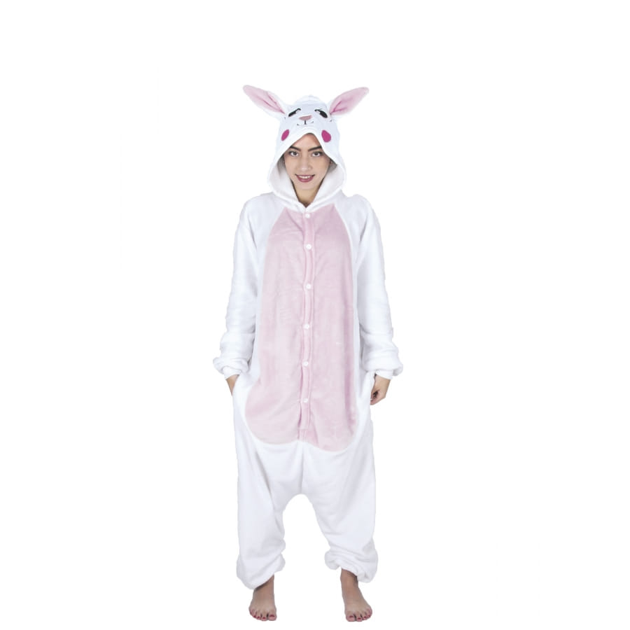 La combinaison kawaï de lapin pour adulte est blanche sur tout le corps et rose au niveau du ventre.