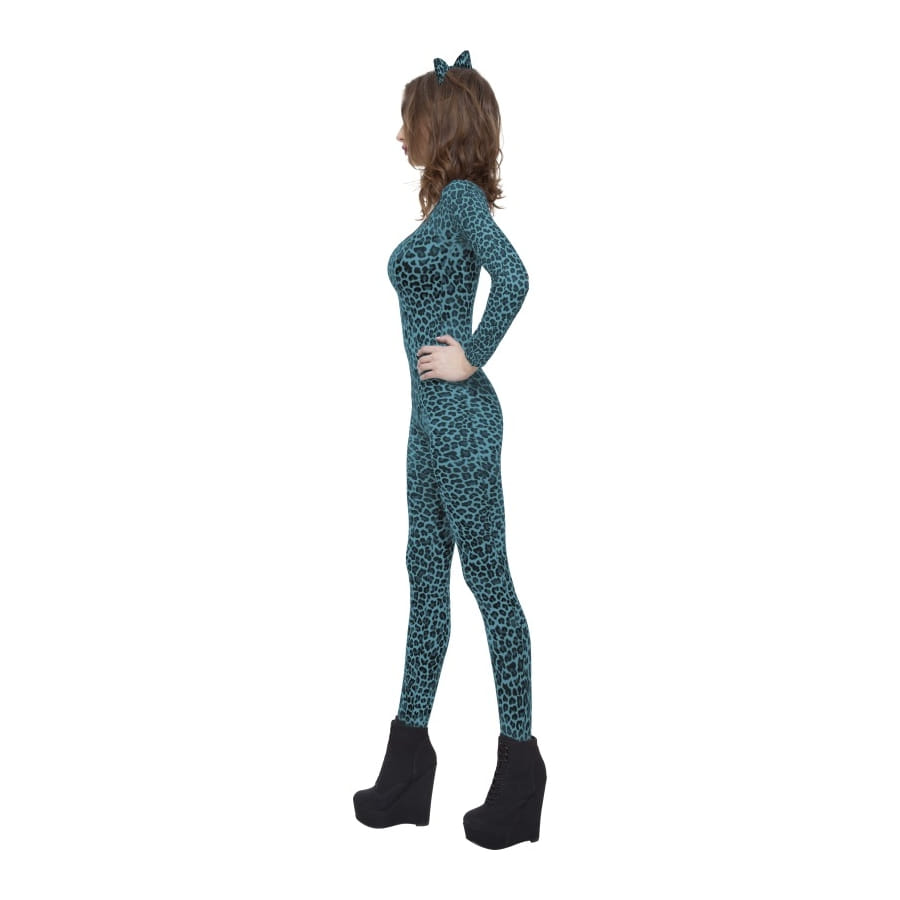 Combinaison moulante, pour femme, entièrement imprimée de motifs léopard de couleur bleue et noire. Ajoutez une paire de talons aiguilles à cette tenue et vous obtenez une tenue sexy pour la Saint Valentin ou pour un enterrement de vie de garçon ou de jeune fille.