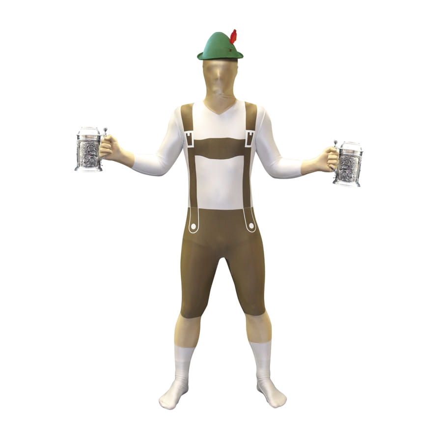 Envie d'être unique sans être reconnu ? Nous vous suggérons ce déguisement combinaison Morphsuit de bavarois, un déguisement sous licence officielle Morphsuit ! En effet, ce costume pour hommes se compose d'une combinaison intégrale de couleur blanche et marron, représentant une parfaite tenue de bavarois, et d'une cagoule assortie. Ce costume s'adaptera très bien à votre morphologie et vous permettra de respirer et de bouger sans difficulté. En plus, il est très simple de le mettre ou de l'enlever grâce à la fermeture éclair présente dans le dos de la combinaison. Vous pouvez choisir entre les tailles suivantes : L/ XL. Il peut être mis presque partout : enterrement de vie de célibataire, anniversaire déguisé, Saint Patrick, spectacle, festival... Et pour plus d'effet, vous pourrez l'accessoiriser à votre guise avec les splendides accessoires que vous trouverez également sur Happyfete.