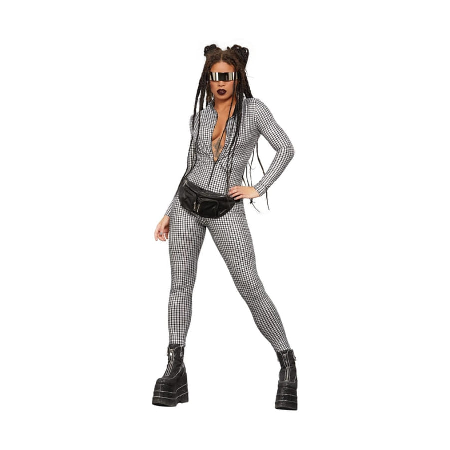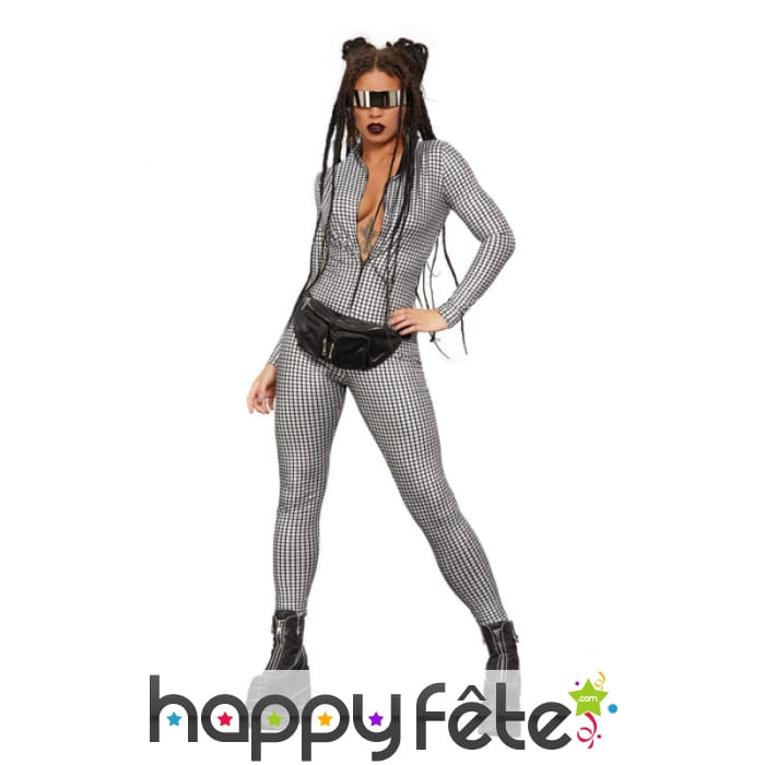 Nous vous proposons la combinaison moulante vichy noir et blanche avec zip.