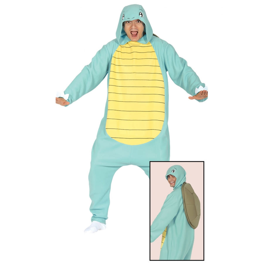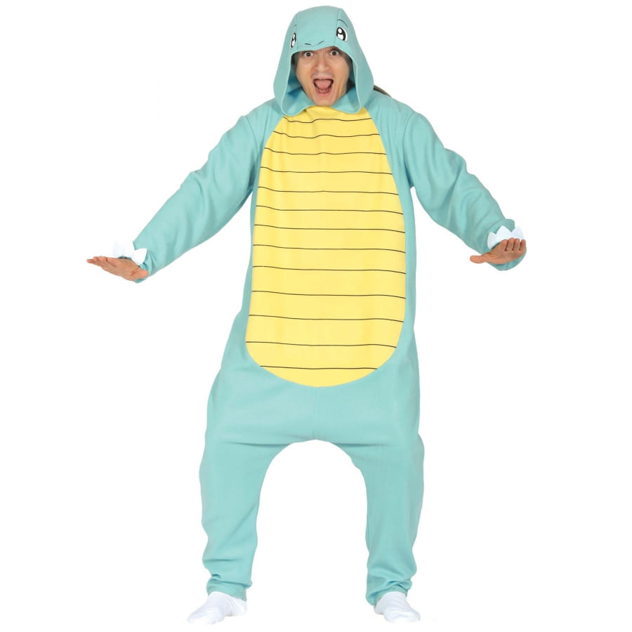 La combinaison petite tortue style Frankelin adulte est de couleur bleue, à l'exception du ventre qui est de couleur jaune avec des rayures.