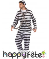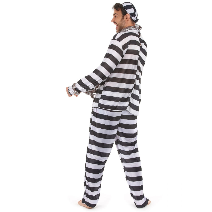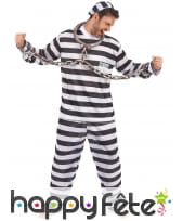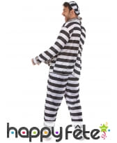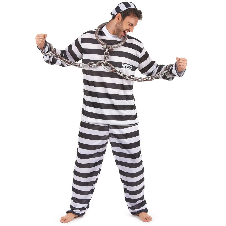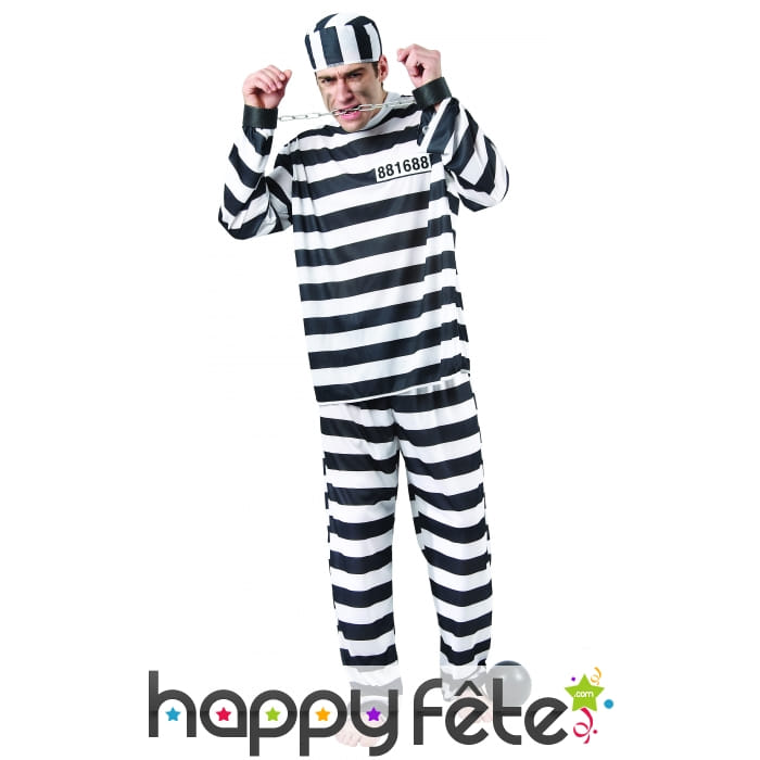 Nous vous proposons Messieurs pour cette fois un déguisement simple et très réaliste, il s'agit d'une combinaison rayée noire et blanche de prisonnier. Le costume est constitué d'un ensemble rayé avec un tee-shirt à manches longues, orné d'un faux matricule sur la poitrine, un pantalon à élastique, qui s'adaptera donc parfaitement à toutes les tailles, et enfin une coiffe assortie. Les rayures sont horizontales comme dans les vraies tenues de prisonniers. Cette tenue légère vous mettra très à l'aise et fera certainement sensation auprès de vos amis. Menottes et boulet sont disponibles parmi nos accessoires pour rendre le tout encore plus réel.