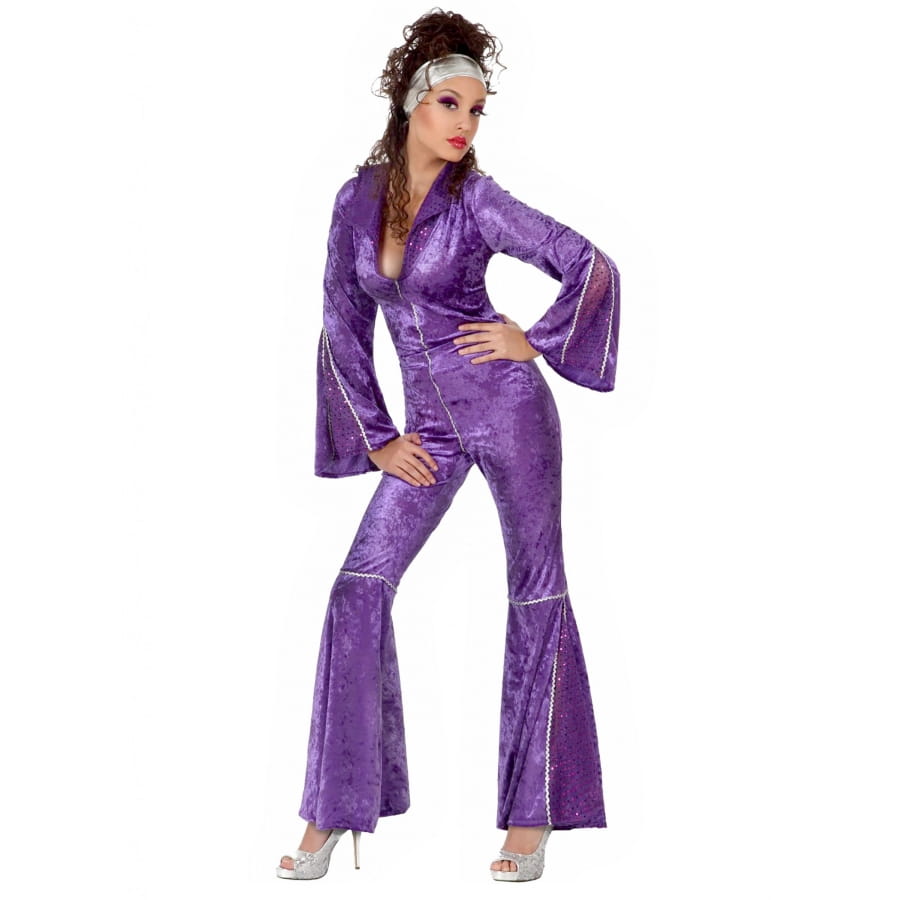 Avec la fête de la musique qui approche, il faut bien se préparer côté déguisement. Les passionnées des années 70-80 n'auront aucun souci à se faire pour trouver le look qui convient. Cette combinaison violette disco effet velours figure parmi les trésors du site happyfete. Il s'agit d'une combinaison qui s'enfile facilement et qui se referme à l'aide de scratchs dans le dos. Elle a été conçue dans un tissu imitation velours de couleur violet. Les manches sont longues et largement évasées. Le pantalon affiche également un effet patte d'éléphant. Le bas des manches et du pantalon sont agrémentées d'un léger tissu pailleté transparent. La combinaison est près du corps et elle est agrémentée d'un magnifique liseré argenté sur tout le long du costume.