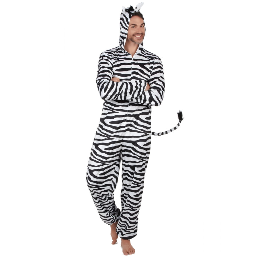 Cette combinaison douce, entièrement rayée de blanc et noir, est conçue pour vous offrir un déguisement de zèbre réaliste et amusant. Les extrémités des jambes et des bras sont élastiques pour assurer un ajustement parfait et pour éviter que les rayures ne s'effacent pas dans la foule.