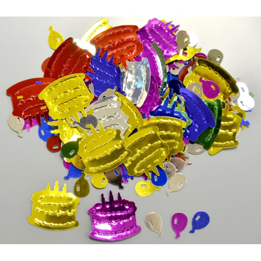 Des confettis multicolores en forme de gâteaux et de ballons. Ces confettis sont vendus en sachet de 14 grammes. Il est impossible de choisir ni le modèle ni la couleur lors de la commande, vous les recevrez comme présentés. Ils sont parfaits pour un anniversaire d'enfant.