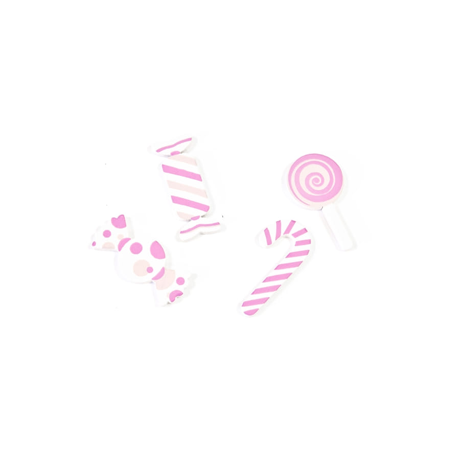 Vous distinguerez différentes formes de friandises, telles que les sucres d'orge, les sucettes, les bonbons, etc.