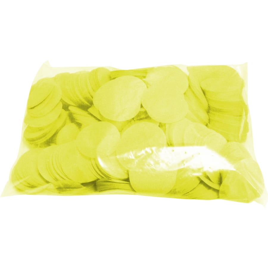 Confettis rond ignifugés et biodégradables de couleur jaune. Chaque confetti possède un diamètre de 5 centimètres et le sachet entier pèse un kilo. Ces confettis seront parfaitement appropriés pour un mariage, un anniversaire ou un carnaval.