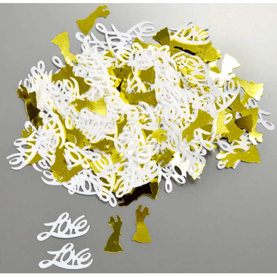 L'amour est à l'honneur avec ces confettis en forme de couple dorés ou "Love" blancs, vendus en sachet de 14 grammes. Il sera impossible de choisir ni le modèle ni la couleur des confettis; ils seront livrés comme présentés. Ils sont parfaits pour un mariage.