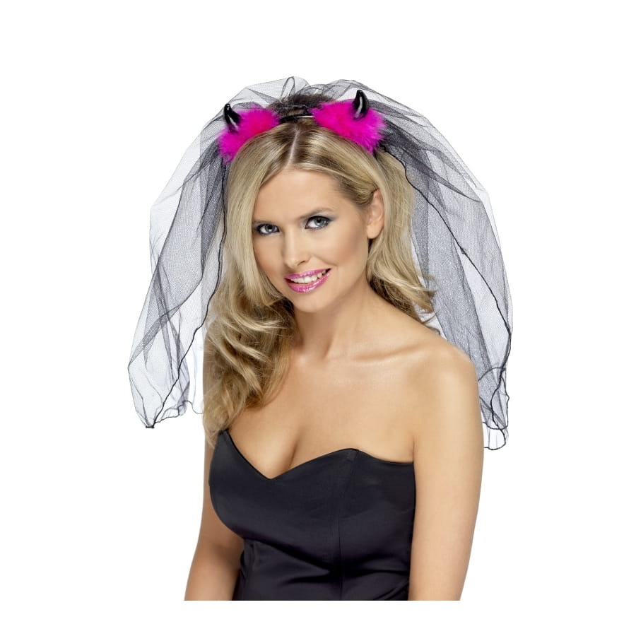 Pour un enterrement de vie de jeune fille vous pourrez vous en servir de ces cornes de diablesse ou encore pour Halloween si vous vous transformez en petite diablesse. Ces cornes sont de couleur noir avec une petite fourrure rose autour des cornes ainsi qu'un voile noir transparent.