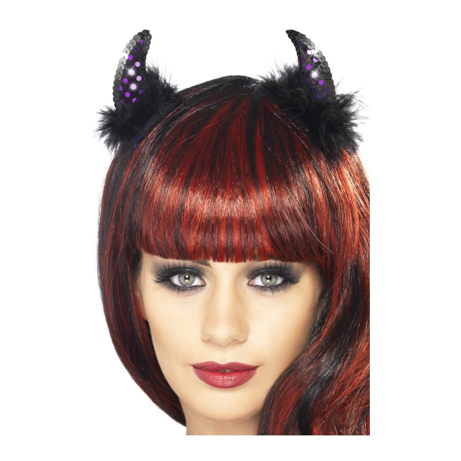 Serre-tête pour femme monté de cornes. Chacune des cornes est orné d'un marabout noir et les cornes elles-mêmes sont en séquins violets. Ajoutez-y une des perruques proposées pour vous transformer en vraie diablesse.
