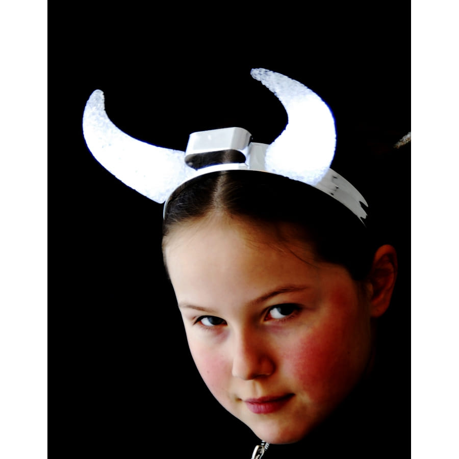 Serre-tête monté d'une paire de cornes LED lumineuses et clignotantes pour garçon ou fille. Lors de la commande, vous aurez la possibilité de choisir entre le modèle blanc ou le bleu. Cet accessoire est idéal pour déguiser votre enfant en parfait petit démon pour Halloween.