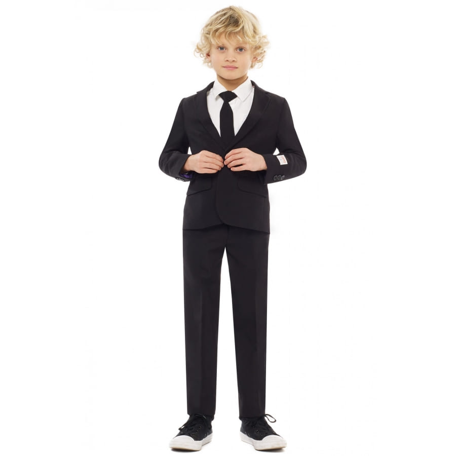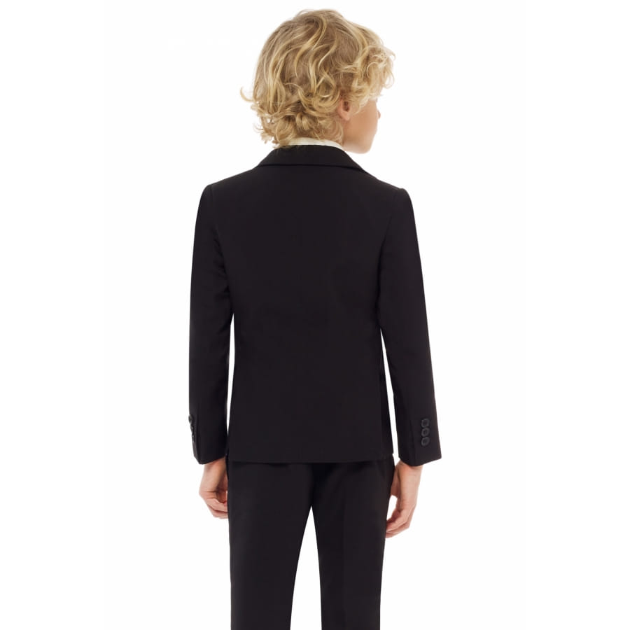 Il s'agit d'un costume enfant de couleur noir uni, composé d'une veste, d'un pantalon et d'une cravate.