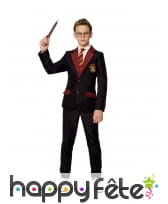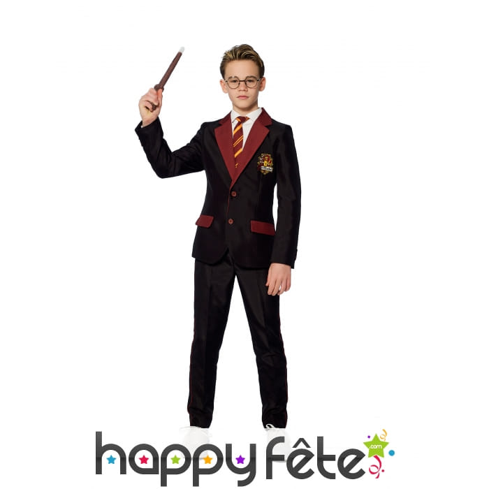 Ce costume comporte tout d'abord une veste noire ornée d'un col et de 2 fausses poches rouges. Le logo de la maison Gryffondor (un lion jaune sur fond rouge) est brodé sur un coté de la poitrine. La veste se ferme grâce à 2 boutons rouges.