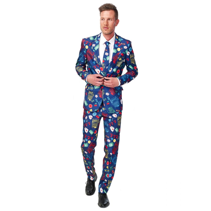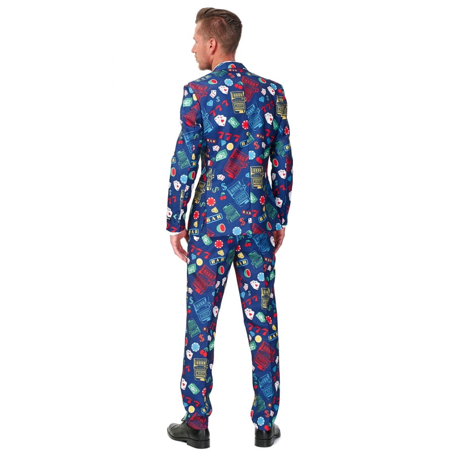 Ce costume 3 pièces imprimé casino est fait à base d'un tissu de couleur bleu ayant des imprimés rappelant le casino tels que des billets verts, des cartes, des jetons...