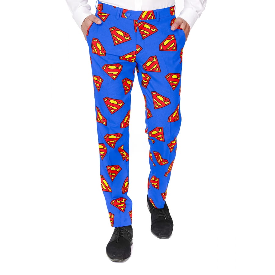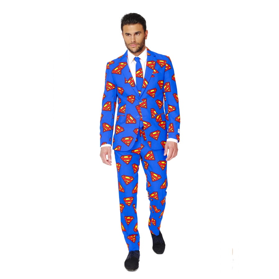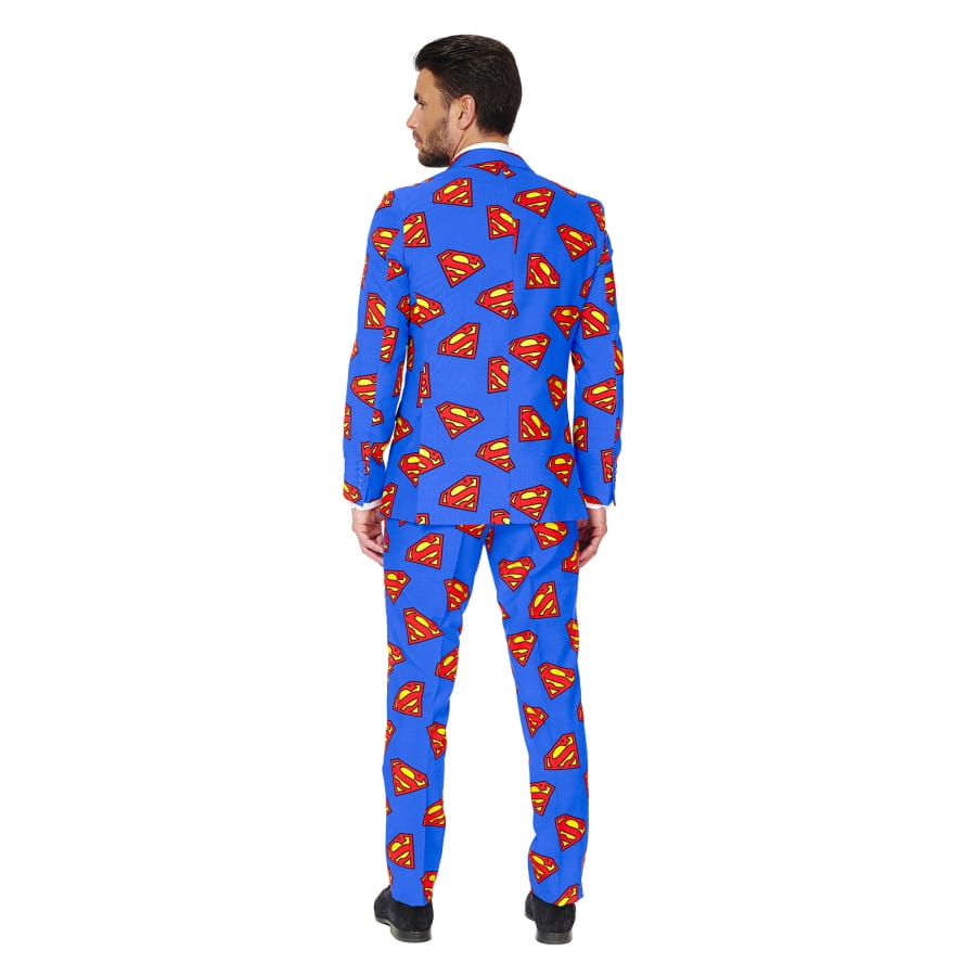 Ce costume bleu à motifs jaunes et rouges qui représentent le S de Superman est un costume de la marque Opposuits.
