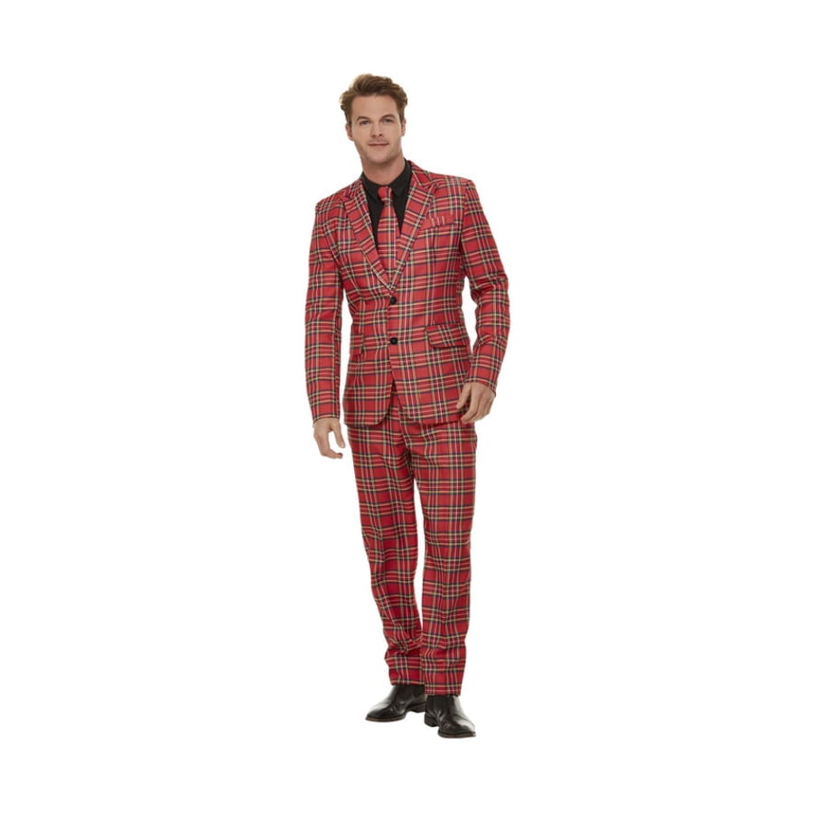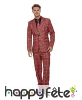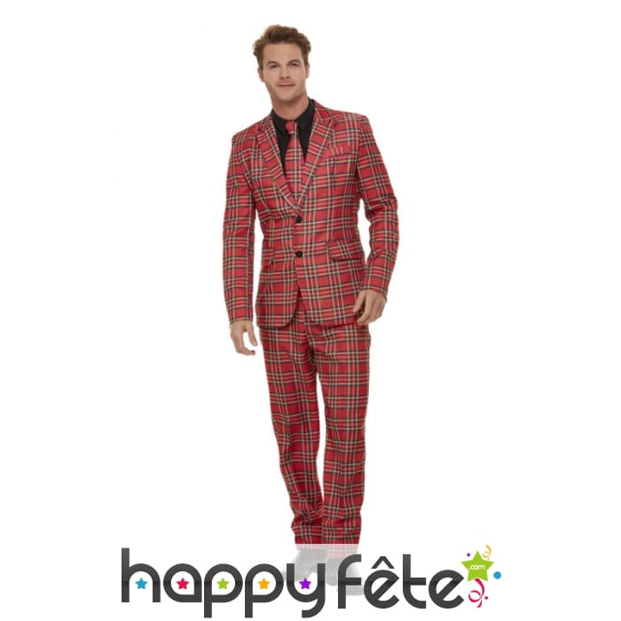 • Ensemble 3 pièces motifs écossais pour adulte comprenant un pantalon, une cravate et une veste.