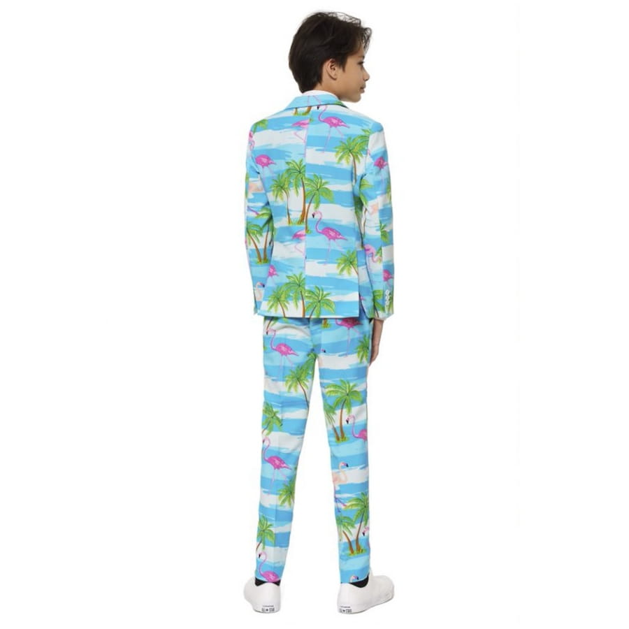 Le costume 3 pièces motif exotique pour ado est un ensemble imprimé de cocotiers et de flamants roses sur un fond de plage.