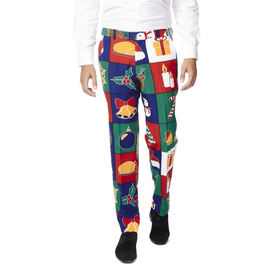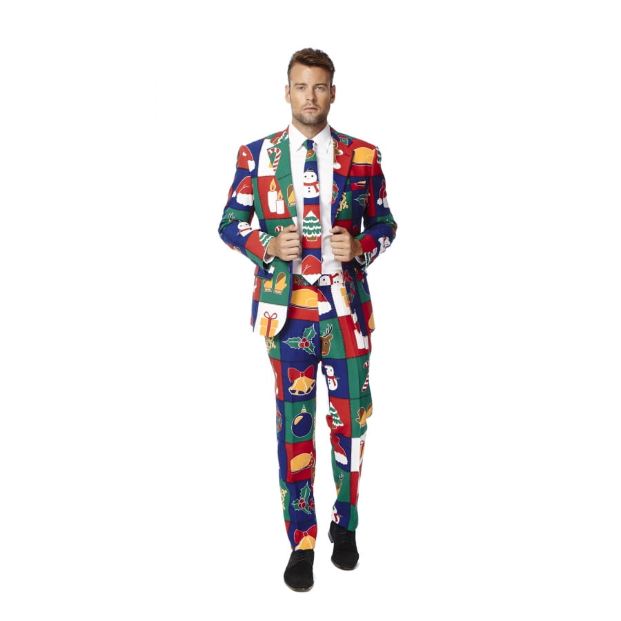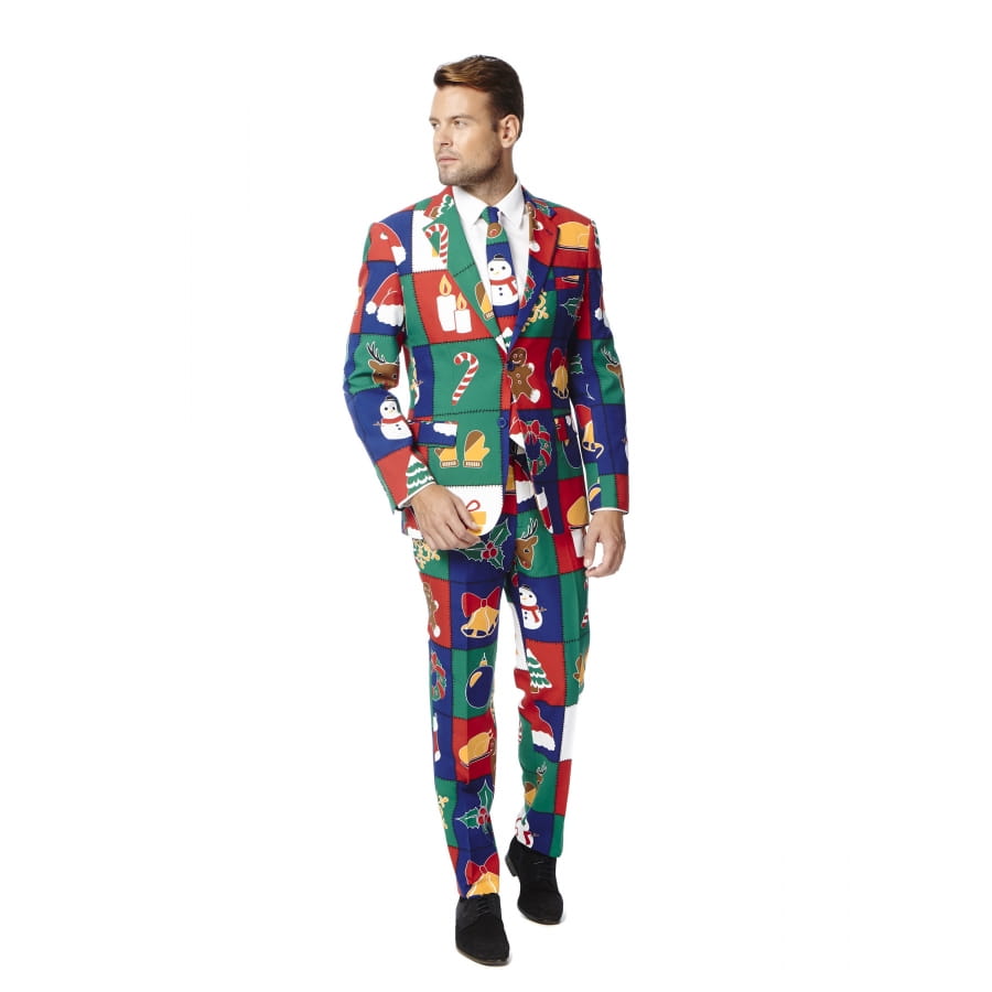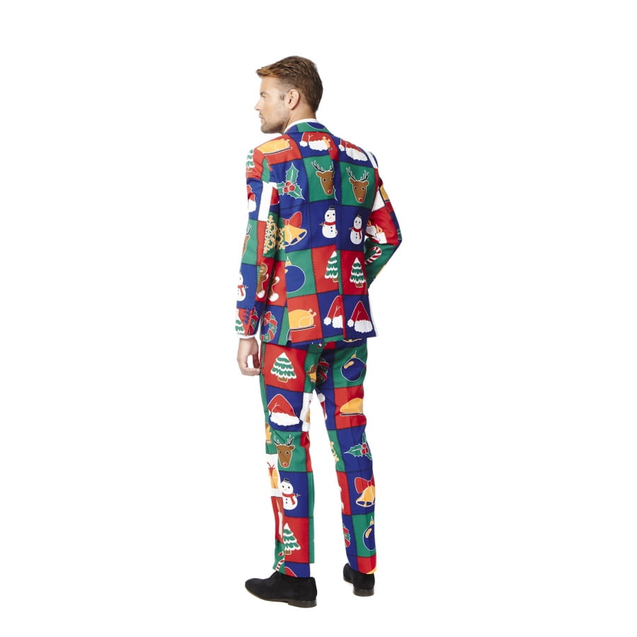 Composée d'une veste, d'un pantalon et d'une cravate,le costume 3 pièces motifs Noël rapiécés est fait d'un tissu épais de plusieurs couleurs,ce qui donne l'impression que celui-ci a été rapiécé.