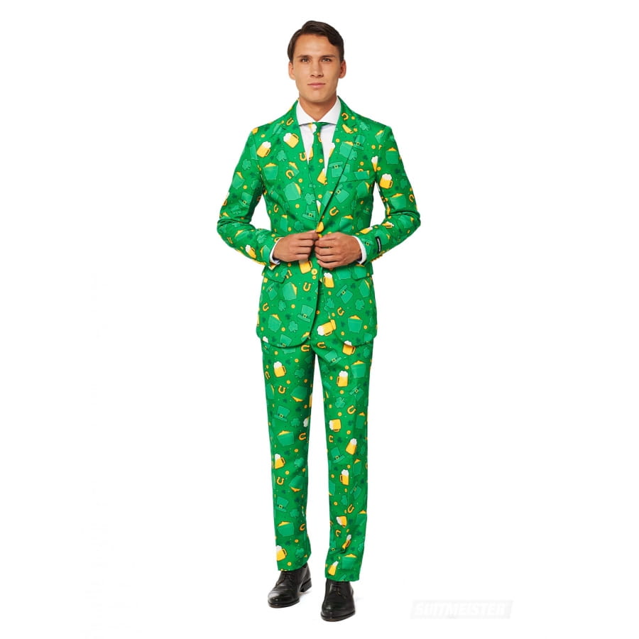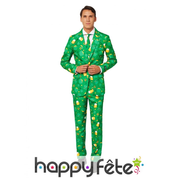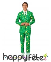Optez pour une tenue classe et originale lors de la prochaine Saint Patrick, en revêtant ce costume 3 pièces motifs trèfles et bières sur fond vert.