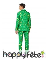 C'est un costume pour homme composé d'une veste verte, avec des motifs en forme de trèfles vert foncé, vert clair et blancs.
